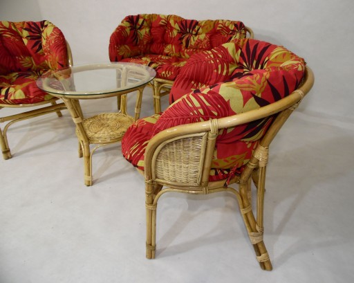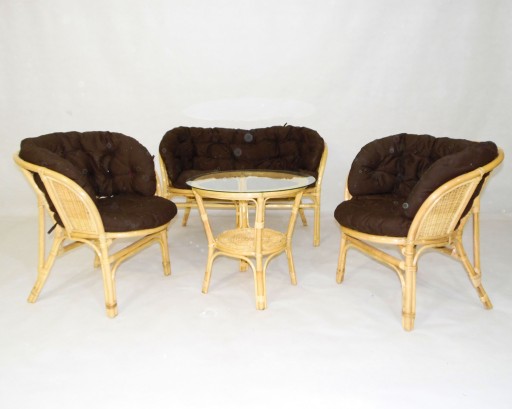 Zestaw mebli ogrodowych FIGA dla 3-4 osób. Elementy zestawu: stolik, 2 fotele, sofa, poduchy do foteli i sofy, szklany blat do stolika