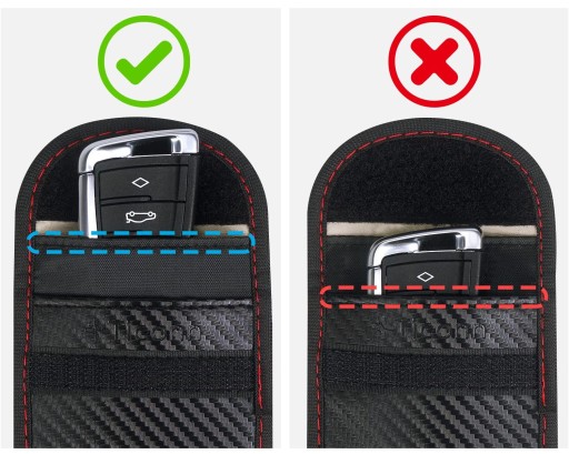 Każdy z pokrowców posiada dwie kieszonki. Aby zabezpieczyć samochód przed kradzieżą, należy włożyć klucz do kieszeni wyłożonej srebrno-złotym materiałem blokującym sygnał.