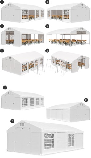 Namioty składane są z modułów o długości 2, 4, 6, 8, 10 lub 12 m oraz 1, 2-metrowych przedłużeń.