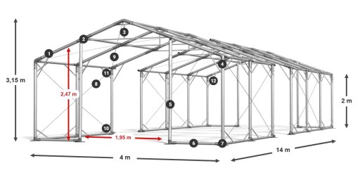 1 - Rury konstrukcyjne fi ok. 50 mm 2 - Łączniki konstrukcji fi ok. 54 mm 3 - Wzmocniona konstrukcja dachowa 4 - Mocne śruby przechodzące na wylot 5 - Wzmocnienia wjazdów 6 - Wzmocniona konstrukcja podłogowa 7 - Powiększone stopy fi 14 cm 8 - Naciągi boczne 9 - Naciągi dachowe 10 - Zastrzały boczne dolne 11 - Zastrzały boczne górne 12 - Zastrzały dachowe