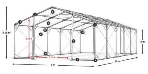 1 - Rury konstrukcyjne fi ok. 50 mm 2 - Łączniki konstrukcji fi ok. 54 mm 3 - Wzmocniona konstrukcja dachowa 4 - Mocne śruby przechodzące na wylot 5 - Wzmocnienia wjazdów 6 - Wzmocniona konstrukcja podłogowa 7 - Powiększone stopy fi 14 cm 8 - Naciągi boczne 9 - Naciągi dachowe 10 - Zastrzały boczne dolne 11 - Zastrzały boczne górne 12 - Zastrzały dachowe