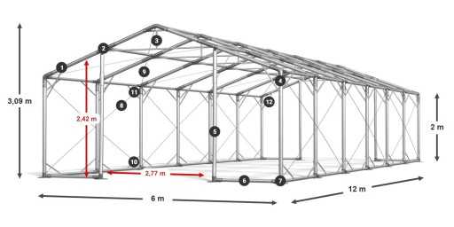 1 - Rury konstrukcyjne fi ok. 50 mm 2 - Łączniki konstrukcji fi ok. 54 mm 3 - Wzmocniona konstrukcja dachowa 4 - Mocne śruby przechodzące na wylot 5 - Wzmocnienia wjazdów 6 - Wzmocniona konstrukcja podłogowa 7 - Powiększone stopy fi 14 cm 8 - Naciągi boczne 9 - Naciągi dachowe 10 - Zastrzały boczne dolne 11 - Zastrzały boczne górne 12 - Zastrzały dachowe