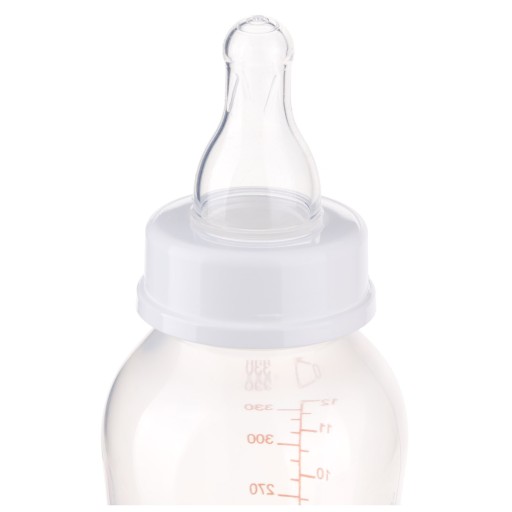 Wyposażona w okrągły smoczek silikonowy o przepływie 12m+, przystosowany do wielokrotnej dezynfekcji.
