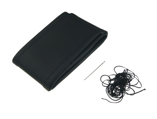 Zmierz średnicę i grubość kierownicy. Szerokość pokrowca to 9 cm. Przed montażem pokrowiec można namoczyć w ciepłej wodzie, ale nie jest to konieczne do poprawnego montażu. Załóż pokrowiec na koło kierownicy, następnie zszywaj przednią i tylną powierzchnię zaczynając od góry schodząc do ramion kierownicy. Naciągnij skórę na ramieniu kierownicy wzdłuż przedniej jego płaszczyzny tak aby zapobiec tworzeniu się fałd. Za ramieniem ponownie przyciągnij do siebie przednią i tylną cześć pokrowca i kontynuuj zszywanie.