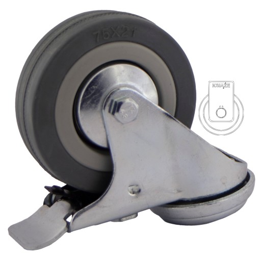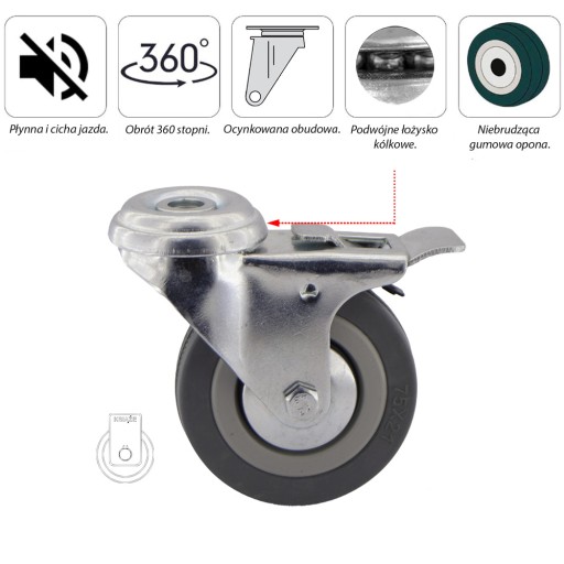 Koło składa się z polipropylenowej piasty oraz z niebrudzącej gumowej opony, posiada łożysko ślizgowe, wersja z osłonką.