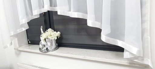 Firana uszyta w łuk ze śnieżnobiałego woalu obszyta białą szeroką lamówką . U góry firany została wszyta taśma marszcząca wraz z tunelem która umożliwia upięcie firany i dopasowanie do szerokości karnisza . Firanę tą można zawiesić na żabkach haczykach bądź na karniszu rurkowym (TUNEL) . Szerokość firany przed zmarszczeniem to 400 cm .