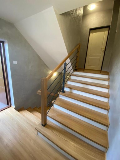 W skład zestawu wchodzą stopnie, spocznik, listwy wykończeniowe oraz zestaw do zestaw elementów balustrady oraz poręcz ścienna dolnego biegu schodów.