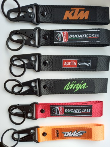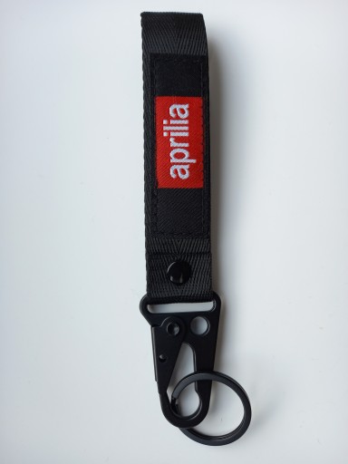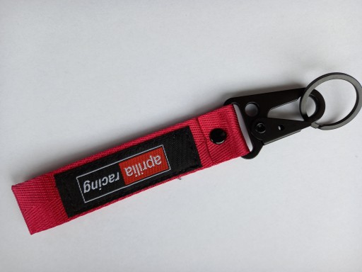 Mała zgrabna czerwona smycz, smyczka, brelok na klucze z firmowymi naszywkami z obydwu stron logo aprilia i aprilia racing. Idealny pomysł na praktyczny i trwały prezent dla miłośnika motocyklingu. Na innych aukcjach oferujemy również smycze i breloki w innych fasonach, kolorach oraz innych marek motocyklowych.