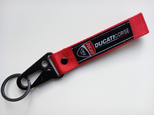 Mała zgrabna czarna smycz, smyczka, brelok na klucze z firmowymi naszywkami z obydwu stron logo DUCATI CORSE. Idealny pomysł na praktyczny i trwały prezent dla miłośnika motocyklingu. Na innych aukcjach oferujemy również smycze i breloki w innych fasonach, kolorach oraz innych marek motocyklowych.