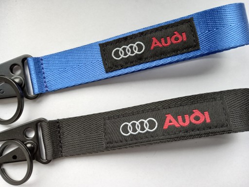 Mała zgrabna smycz, brelok na klucze z naszywką z logo Audi do wyboru w kolorach; czerwonym lub niebieskim lub czarnym jak na foto (kolor czarny jest aktualnie już dostępny). Przy zakupie proszę o informację o wyborze koloru. Idealny pomysł na prezent dla miłośnika marki. Na innych aukcjach oferujemy również smycze i breloki w innych kolorach oraz innych marek.