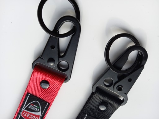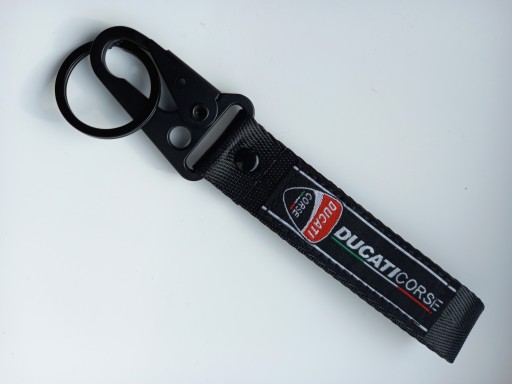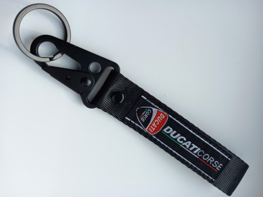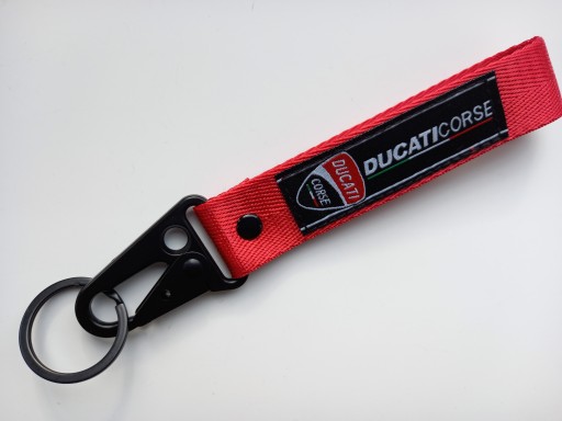 Mała zgrabna czerwona smycz, smyczka, brelok na klucze z firmowymi naszywkami z obydwu stron logo DUCATI CORSE. Idealny pomysł na praktyczny i trwały prezent dla miłośnika motocyklingu. Na innych aukcjach oferujemy również smycze i breloki w innych fasonach, kolorach oraz innych marek motocyklowych.