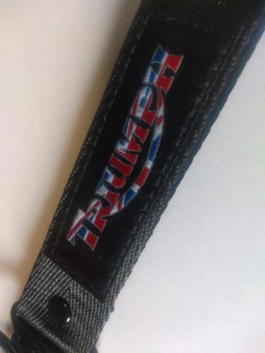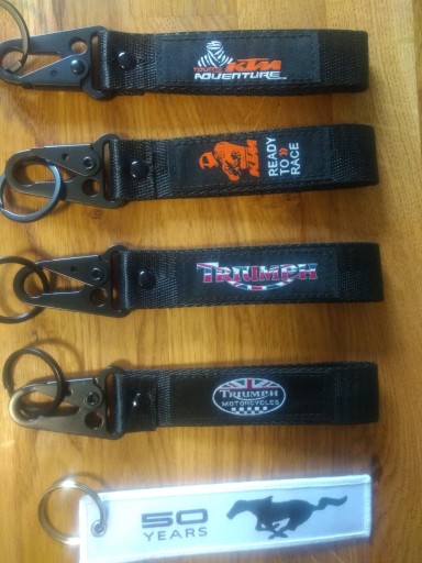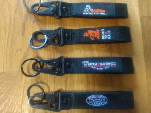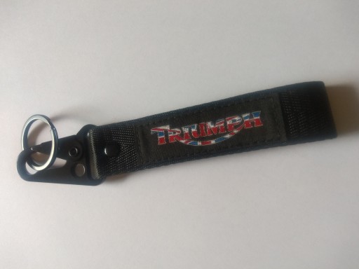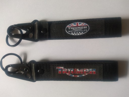 Mała zgrabna czarna smycz, smyczka, brelok na klucze z naszywkami Motorcycles Triumph z obydwu stron. Idealny pomysł na praktyczny i trwały prezent dla miłośnika motocyklingu. Na innych aukcjach oferujemy również smycze i breloki w innych kolorach oraz markach.