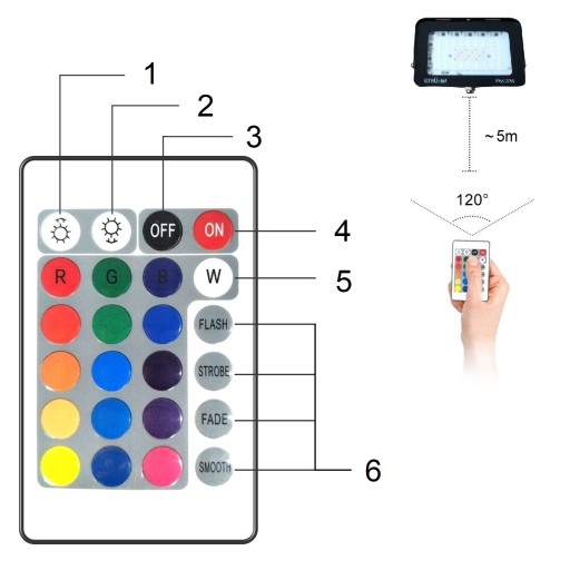 ✔️Sterowanie reflektorem odbywa się za pomocą pilota na podczerwień. Dzięki niemu można wybrać jeden z 16 indywidualnych kolorów które można ściemniać lub rozjaśniać lub wybrać jeden z kilku trybów świecenia, a sam naświetlacz posiada funkcję pamięci dzięki której po odłączeni zasiania zapamiętuje wcześniej ustawiony kolor lub program. Stosując kilka naświetlaczy razem można je zsynchronizować ustawiając za pomocą pilota dowolny kolor lub tryb RGB, a po odłączeniu zasilania i ponownym podłączeniu wszystkie naświetlacze rozpoczynają pracę w tym samym trybie. W zestawie bateria do pilota (CR 2025)