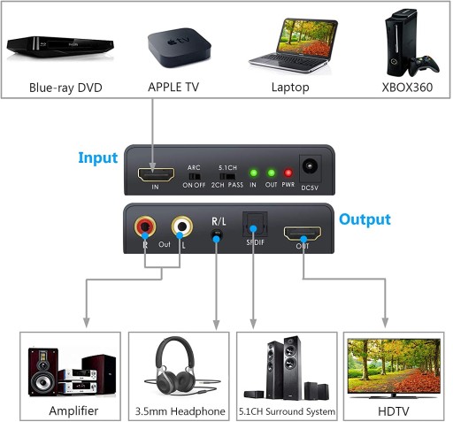 Umożliwia przesłanie sygnału z HDMI do HDMI / Optyczny Toslink SPDIF / RCA L/R / 3.5mm