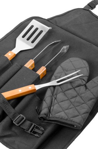 Zestaw narzędzi do grillowania w komplecie z rękawicą oraz fartuchem, który pełni także rolę etui.