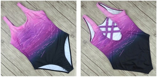 Jednoczęściowy kostium kąpielowy w fioletowym kolorze.