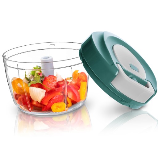 Żeby posiekać produkty, wystarczy włożyć składniki i pociągnąć za uchwyt na sznurku a obracające się ostrza natychmiast je rozdrobnią.
