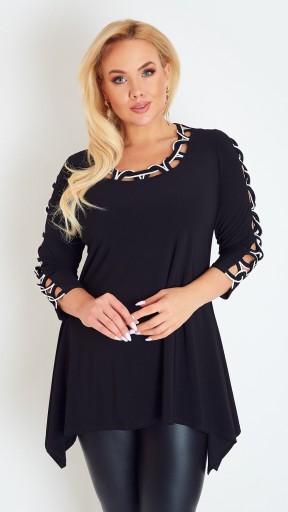 - Posiada wyjątkowy dekolt i rękawy dzięki zastosowaniu połączonych ze sobą lamówek z atłasowymi wypustkami.