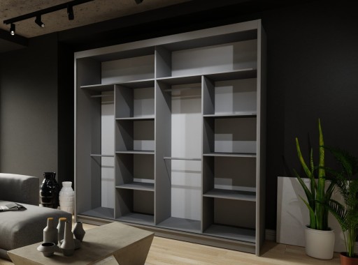 Przemyślane pojemne wnętrze szafy pozwoli na zaoszczędzenie miejsca według własnych potrzeb. Wnętrze posiada cztery drążki na wieszaki i osiem praktycznych półek. Dzięki ruchomości wnętrza, drążki oraz półki można dowolnie montować i modyfikować według własnego pomysłu.