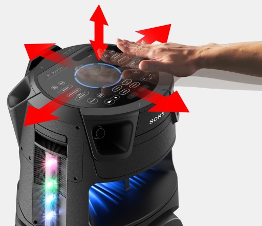 Wykonując poziome i pionowe ruchy ręką, możesz pomijać utwory, zmieniać efekt z flangera na WAH, zwiększać poziom dźwięku z mikrofonu do karaoke, zmieniać tonację muzyki i mikrofonu lub podkręcać głośność. Dzięki systemowi obsługi gestami szybko i łatwo zmienisz ustawienia zestawu MHC-V73D — nie tracąc ani chwili imprezy.