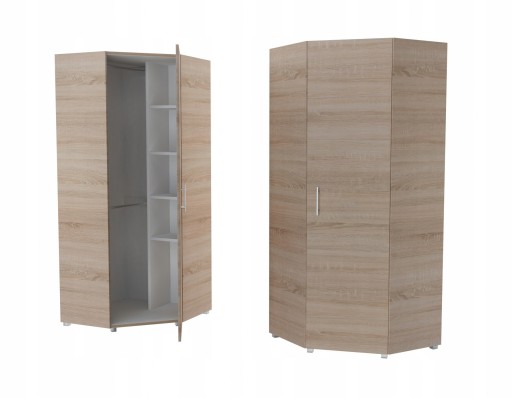 Stylowa i uporządkowana przestrzeń nie wymaga dużego metrażu. Szafa narożna pozwoli Ci zagospodarować niewielkie naroże w korytarzu, sypialni lub pokoju dziecka. Niewielkie gabaryty mebla idą w parze z jego pojemnością. Szafa posiada cztery pakowne półki po prawej stronie oraz wnękę z dwoma metalowymi drążkami po lewej. Przechowasz w niej więcej, niż może się wydawać – od miękkich swetrów i wygodnych spodni, po wizytowe koszule i marynarki.