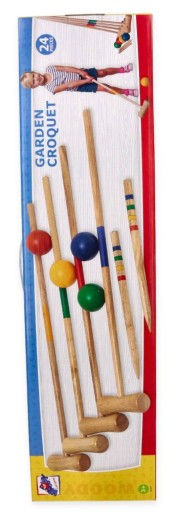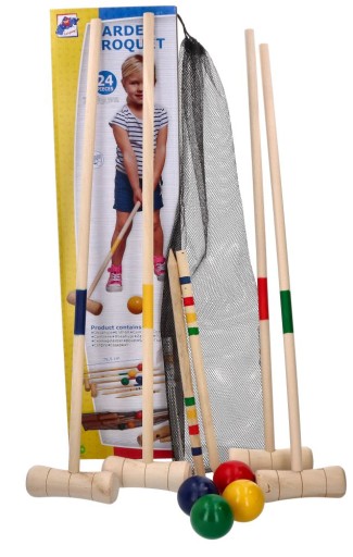 W zestawie: 4 duże drewniane kije,4 drewniane kule w kolorze czerwonym, żółtym, niebieskim i zielonym, dwa drewniane, zaostrzone paliki do oznaczenia startu i mety, 10 metalowych bramek, siatka do zapakowania całości