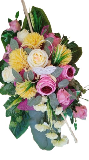 Kompozycja sztuczna (tzw. stroik, ikebana) jest wykonana z sztucznej choiny w doniczce plastikowej co daje jej stabilność.