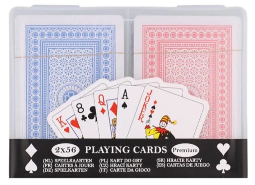 Opakowanie zawiera dwie talie kart każda po 56 kart.