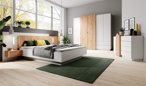 - łóżko ze stolikami nocnymi i oświetleniem,
