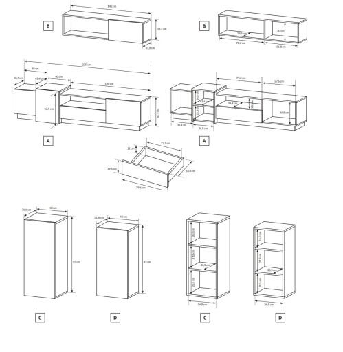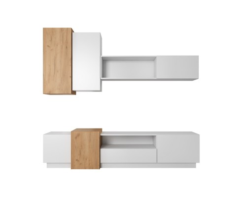 - w skład zestawu wchodzą szafki wiszące z półką oraz stolik RTV z szufladą,