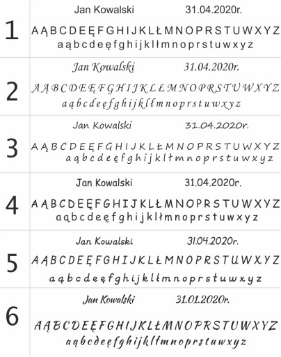 Podczas zamówienia należy w wiadomości zamieścić takie informacje jak: Imię, numer czcionki.