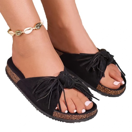 Eleganckie klapki damskie ze skóry ekologicznej zamszowej, zdobione frędzelkami. Gumowa podeszwa zdobiona materiałem a'la korek. Perfekcyjny dodatek do niemal każdej stylizacji! UWAGA: model może posiadać śladowe ilości kleju przy podeszwie.