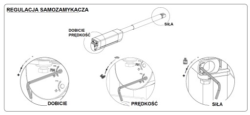 Teraz funkcja domyku, siły i prędkości zamykania można wyregulować w sposób ciągły. Dzięki temu można po instalacji dokładnie ustawić różne parametry pod zamki a inne pod zwory magnetyczne. Do śrub regulacyjnych jest bardzo dobry dostęp na tylnej obudowie samozamykacza.