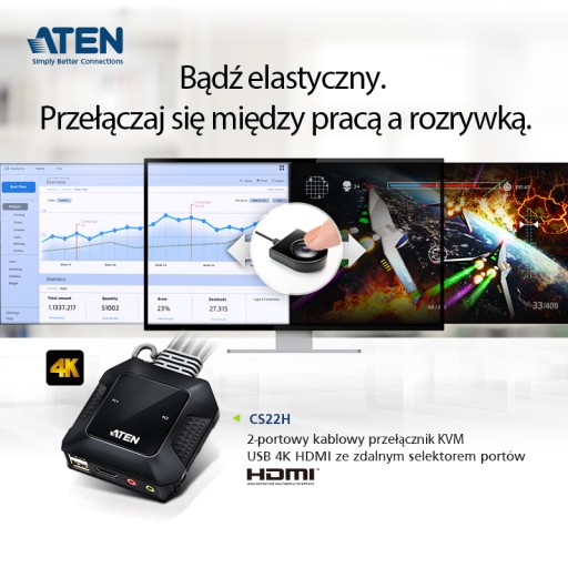 Przełącznik kablowy KVM ATEN CS22H zapewnia natychmiastowy dostęp do dwóch komputerów z portami USB i HDMI za pomocą 1 zestawu monitora, klawiatury i myszy. Oferuje jednocześnie najwyższą jakość wideo do 4K DCI (4096 x 2160 @ 60 Hz) oraz zapewnia maksymalną wygodę i optymalny obraz. Zdalny selektor portów umożliwia szybkie i proste wybieranie komputerów. Urządzenie CS22H nie musi stać na widoku. Wystarczy umieścić na biurku zdalny przycisk.