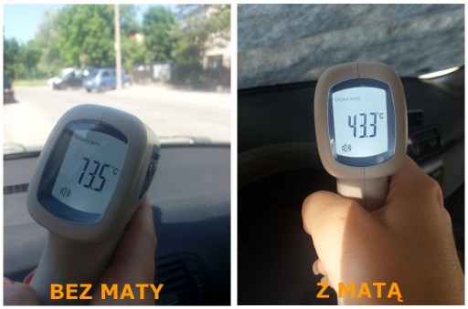 Pomiar robiony w lecie w bardzo upalny dzień w samochodach zaparkowanych obok siebie.. Jedno auto stało bez założonej maty, drugie z matą. Różnica w temperaturze deski rozdzielczej znacząca