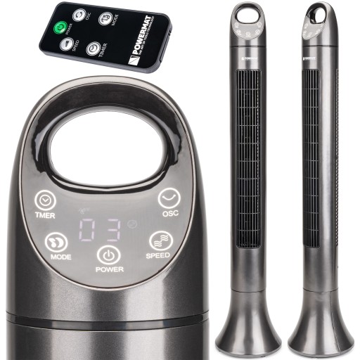 Wentylator kolumnowy (wieżowy) marki POWERMAT model Satin Tower-80 z racji swoich wymiarów (wysokość 98cm) siła dmuchania jest większa przy mniejszej prędkości obrotowej. Dzieki takim wymiarom wentylator jest cichszy niż mniejsze wersje.