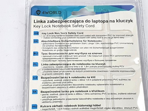 Linka stalowa o długości 1,8 m; umożliwia łatwe podłączenie do dowolnego notebooka wyposażonego w gniazdo zabezpieczające.