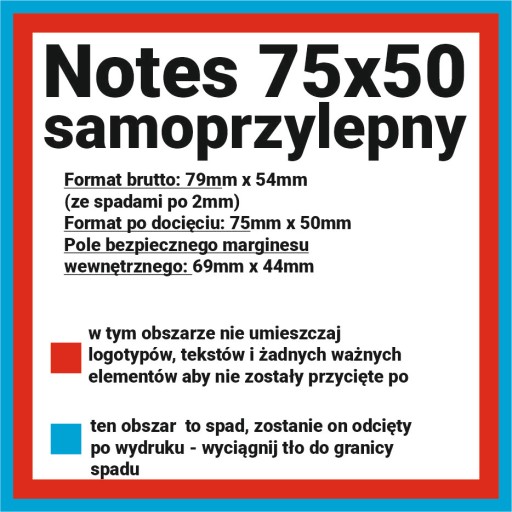 - Gotowy plik do druku (dotyczący notesów formatu 50x75) powinien mieć format końcowy 54mm x 79mm: (wymiar netto 50mm x 75mm + spad: 2 mm)