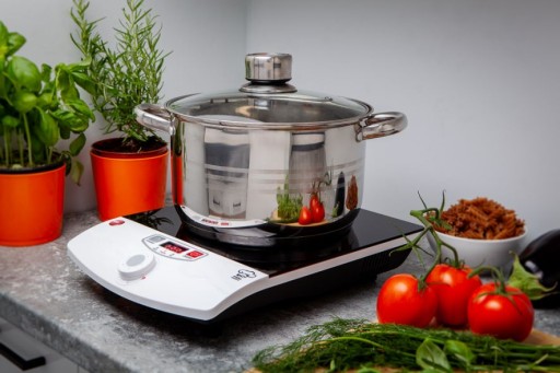 Funkcjonalna, niewielka i nowoczesna kuchenka indukcyjna przeznaczona do szybkiego przygotowywania artykułów spożywczych w naczyniach indukcyjnych.
