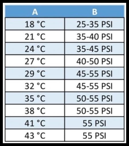 W zależności od temperatury panującej na zewnątrz podczas napełniania, prawidłowe ciśnienie na manometrze może się różnić. Jest to przykładowa tabela temperatur. Oczywiście możemy nabijać poniżej 18°C z tym, że manometr będzie wskazywał ciśnienie poniżej 25 PSI.