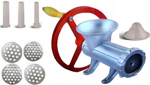 ŻELIWNA RĘCZNA MASZYNKA Z KOŁEM DO MIELENIA MIĘSA / NADZIEWANIA KIEŁBASY 2 w 1 Z AKCESORIAMI