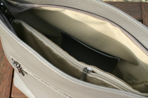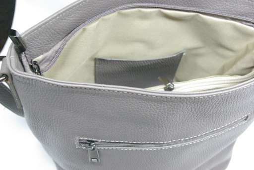 Wewnątrz znajdują się trzy przegrody, z czego jedna zamyka się na suwak. Posiada dwie dodatkowe kieszonki zapinane na zamek wewnątrz oraz na zewnątrz torebki. Ozdobne paseczki na przedniej stronie torebki. MADE IN ITALY.