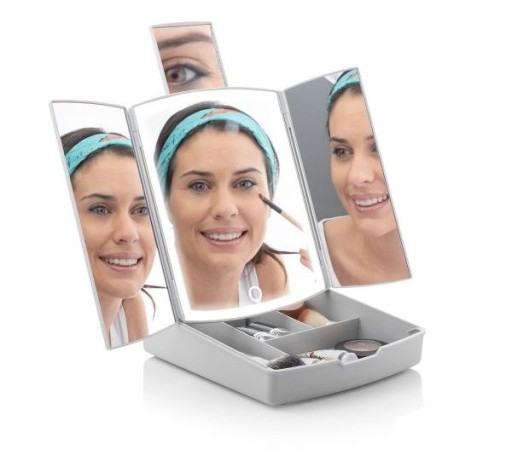 Oryginalne składane lusterko do makijażu z podświetleniem LED i organizerem (wielofunkcyjne 3 w 1), zapewniające optymalną widoczność podczas nakładania makijażu. Nowoczesna i składana konstrukcja ze schowkiem na przybory i kosmetyki do makijażu, pozwala zaoszczędzić miejsce i jednocześnie umożliwia trzymanie wszystkiego co potrzebne do wykonania makijażu zawsze pod ręką. Lusterko ma wszechstronne zastosowania i pozwala na elastyczność w temacie zasilania, gdyż można je podłączyć za pomocą kabla USB do micro USB (w zestawie) lub przy użyciu baterii (brak w zestawie), w zależności od preferencji w danym momencie. Lusterko wyposażono w oświetlenie LED z dotykowym sterowaniem i 3 trybami świecenia (światło chłodne, światło ciepłe, światło dzienne). To przenośne panoramiczne lusterko biurkowe składa się w lusterka centralnego oraz dwóch składanych i rozkładanych paneli bocznych z lusterkiem. Ponadto dzięki dodatkowemu tylnemu wysuwanemu lusterkowi powiększającemu możliwe jest 7x powiększenie pożądanego obszaru twarzy. Lusterko wyposażono w małe antypoślizgowe nóżki umożliwiające stabilne postawienie produktu.