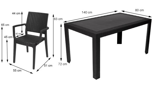 Blat stołu jak również krzesła wykonane są z odlewu polipropylenu w stylistyce technorattanu . Po środku blatu znajduje się praktyczny i przydatny otwór na parasol ogrodowy.