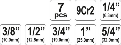 W skład zestawu wchodzi 6 głowic wymiennych o rozmiarach <span>1/4cala (6,3mm), 3/8cala (10mm), 1/2cala (12,5mm), 3/4cala (19mm), 1cal (25mm), 5/4cala (32mm).</span>