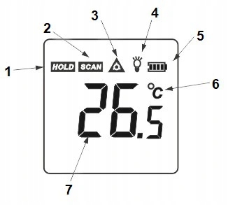 - Spust: po naciśnięciu, wyświetlacz LCD wyświetli ikonę skanowania , po zwolnieniu, urządzenie pokaże wynik przez około 7 sekund, następnie ekran wyłączy się. Dzięki funkcji auto-off urządzenie wyłącza się automatycznie oszczędzając baterie.