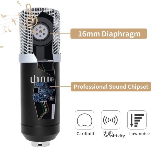 Dzięki 16-milimetrowemu elektretowemu przetwornikowi pojemnościowemu mikrofon podcastowy może zapewnić silną odpowiedź basową. Ten profesjonalny mikrofon pojemnościowy odbiera krystalicznie czysty dźwięk. Pierścień magnetyczny na kablu mikrofonu USB ma silną funkcję przeciwzakłóceniową.
