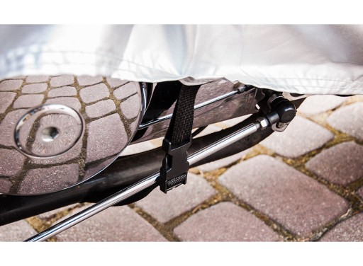 Na dole, na środku do pokrowca zostały przyszyte paski z klamrą do zapięcia pod motocyklem. Paski skutecznie utrzymują pokrowiec na swoim miejscu, minimalizując ryzyko zsunięcia się go, nawet podczas bardzo silnego wiatru.