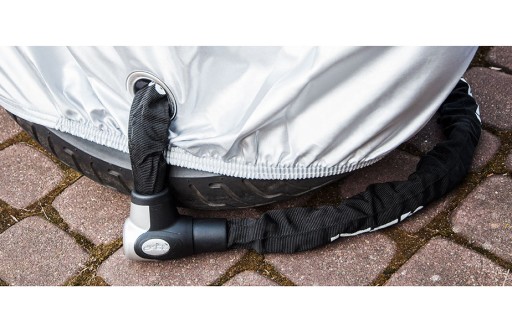 Pokrowiec posiada dwa otwory o średnicy 4 cm, umożliwiające założenie blokady na przednie koło, chroniącą przed kradzieżą motocykla.