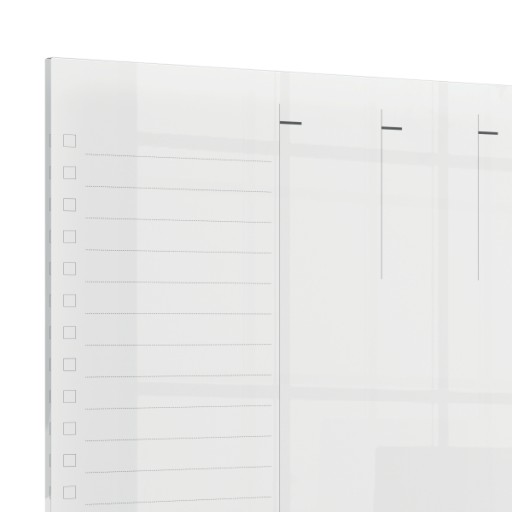 Tygodniowy planer suchościeralny do domowego biura, o nowoczesnym, bezramkowym wzornictwie, z naniesioną siatką do planowania tygodnia, jest idealny do robienia notatek, zapisywania pomysłów lub ważnych dat. Planer może być umieszczony na ścianie za pomocą samoprzylepnych podkładek lub na powierzchni metalowej za pomocą magnesów albo położony płasko na biurku lub innej powierzchni roboczej. Dzięki swej przezroczystości planer płynnie wtapia się w tło, gdy nie jest używany. Akrylową powierzchnię suchościeralną można łatwo wytrzeć do czysta, więc po prostu - zapisz coś, zetrzyj i napisz kolejną notatkę. Dostarczany z markerem do tablic suchościeralnych. Format: A3.